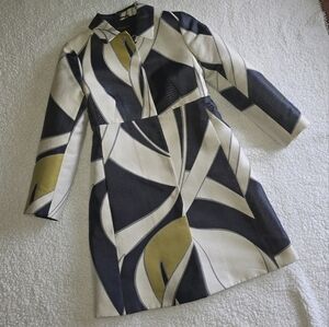 Elevate your outerwear collection with this chic Ann Taylor Abstract Mod Print Coat! This stylish trench-style jacket features a striking abstract geometric pattern in a sophisticated palette of cream, navy blue, and mustard yellow accents. It's perfect for adding a touch of vintage-inspired elegance to any outfit, whether for the office or that special occacion!