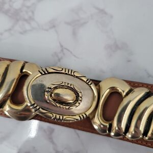Brown Leather belt with gold metal shaped like a shell on either side of the buckle. Gold and silver toned buckle with some tarnish in the center. Made in Italy. Only 2 Studs for adjustments.
