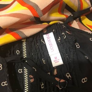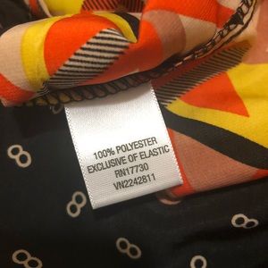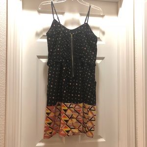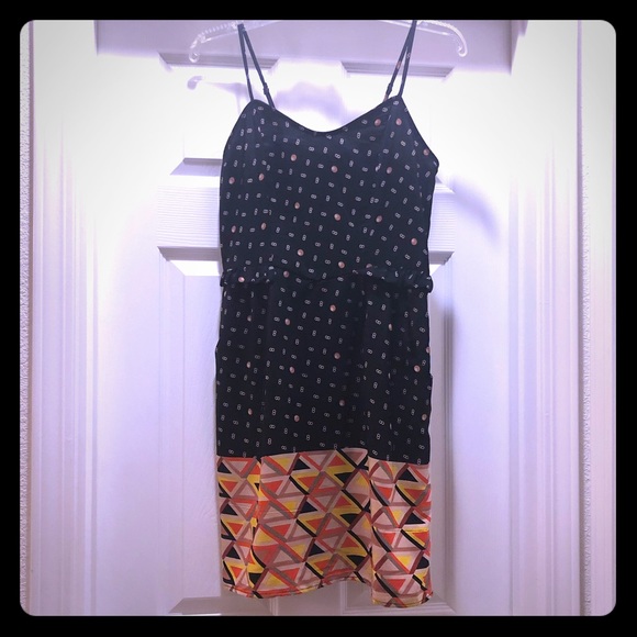 Funky print, ruffle detailing, pockets, elastic back with gold zipper. Adjustable straps.