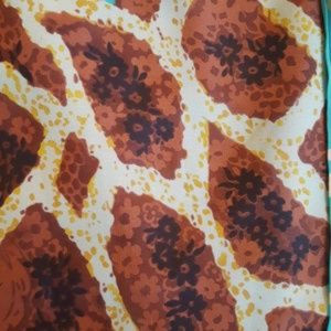 Turquoise and cream around neck gradually evolves into a brown, cream, yellow and black pattern. Halter ties around neck, light flowy and fully lined. Bust 34", length 30". Comfortable and gorgeous! Tag has been removed, it's a size Medium.