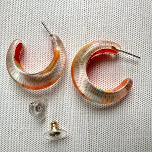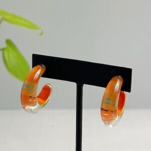 These lightweight Lucite hoops combine a retro-inspired design with vivid orange and blue accents, offering a fun pop of color for everyday wear.