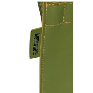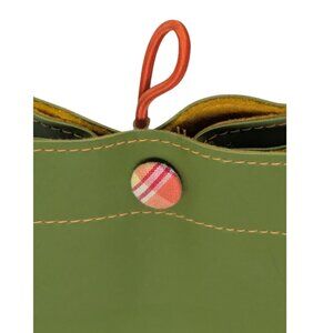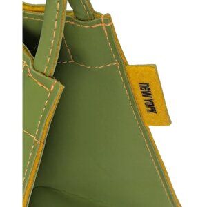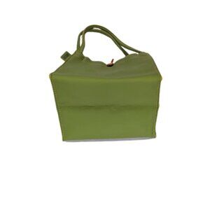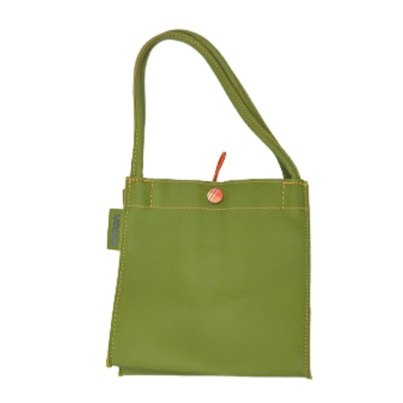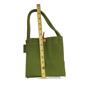 Cute and functional Alan Stuart New York vinyl tote in a stylish leaf-green shade with contrast stitching. Features a simple button-loop closure, structured silhouette, and a soft felt interior. Lightweight, modern, and perfect for everyday essentials.