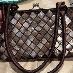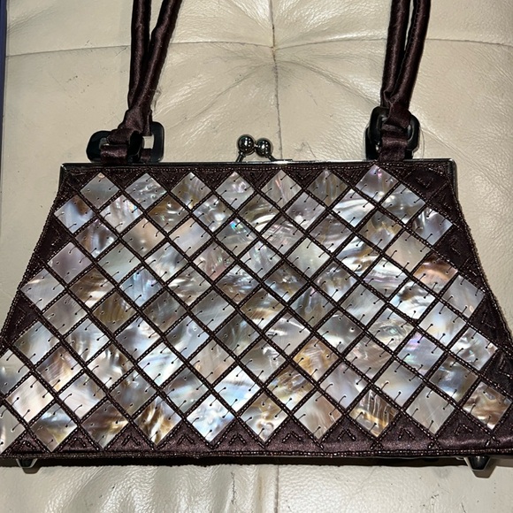 Natural shell and bead embellishments make this Mod handmade handbag a statement piece it is a pretty bag unique and colorful. It is Dark Brown satin with a satin lining and zip inside pocket. The feet on this bag keep it clean on the bottom.