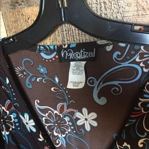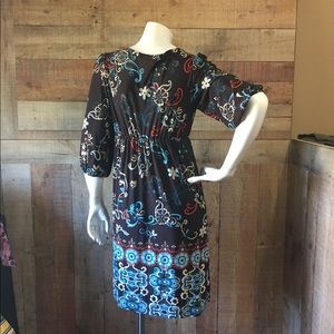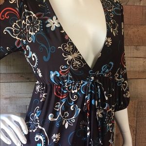 Brown background with a "Mod" Floral pattern. Deep V-Neck, 3/4 sleeves and cinch tie waist. Size small, 12.5" across x almost 35" long. 95% Poly, 5% spandex. Excellent condition. hypnotized Brand.