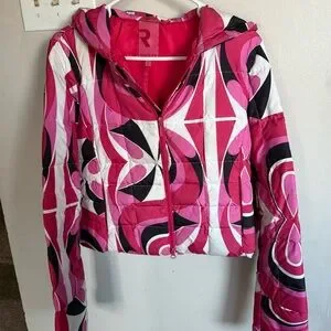 This jacket is so cute with a funky design. You can roll the cuffs up for a different look. It’s a short waisted ski type coat. Unfortunately, it just doesn’t fit me anymore. Very good condition.