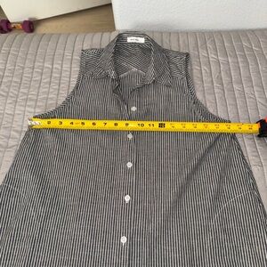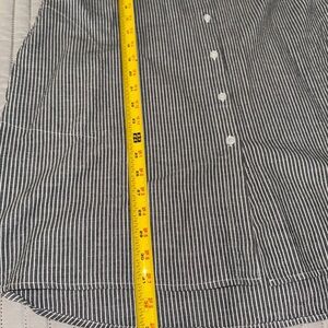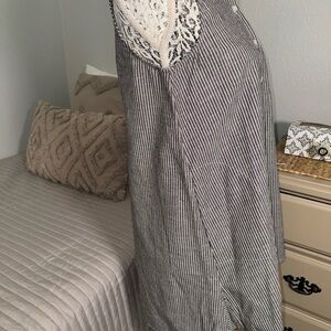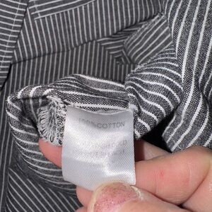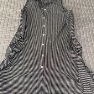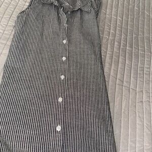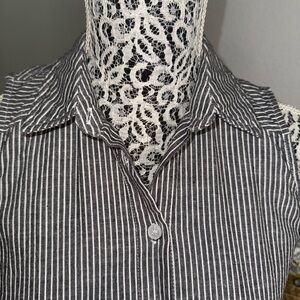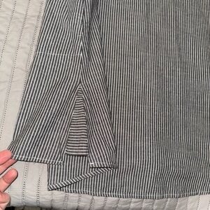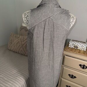 Mod Ref 100% cotton Linen look grayish black & white striped full button down dress. With side pockets. Gorgeous bohemian Nautical vibe. Very elegant for a trip to the beach or a nice brunch excellent quality and comfort. With a linen feel and look. Very chic. Please see photos for measurements.