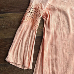 Keywords: Peach Colored Dress, Peach, Light Orange Dress, Long Sleeve Dress, Bohemian Dress, Boho, Bohemian Style Dress, Mod Ref Dress, Lace, Dress with Lace, Flowy Dress, Dress with Long Sleeves, Bell Sleeves