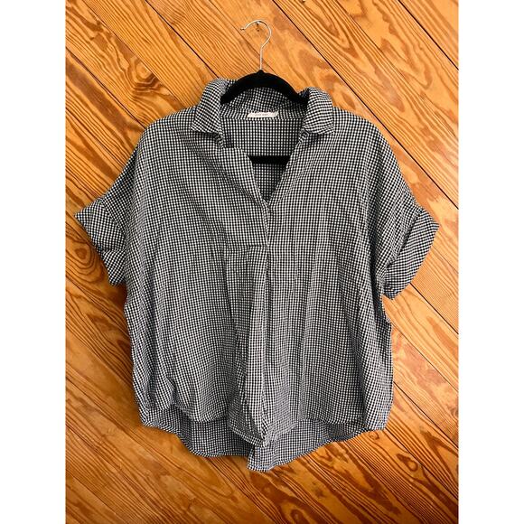 Mod Ref Gingham Blouse in Black and White Size Medium GUC - no notable flaws. Relaxed fit Cuffed sleeves Back button detail Cotton poly mix