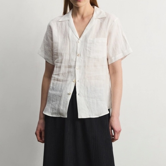 Never worn, NWOT. 100% linen blouse with open collar and mother of pearl buttons, sold out online