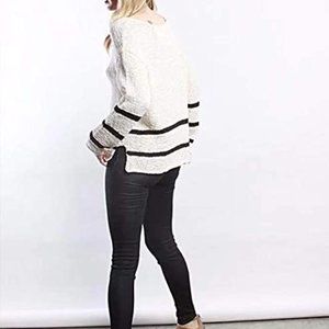 Long sleeved cream sweater with black stripes. Hand Wash 75% Acrylic/ 25% Polyester