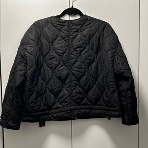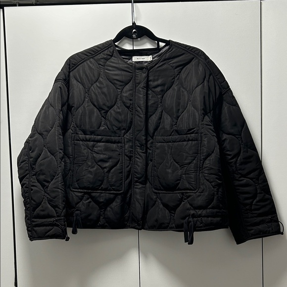 Quilted jacket with zip closure and button placket. The jacket features front patch pockets and includes adjustable cords at the wrist and jacket hem.