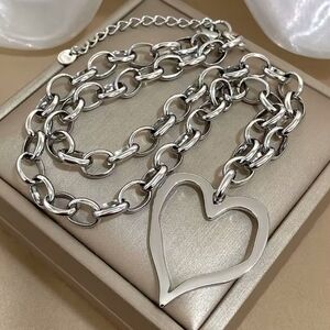 Mod Silver Heart Chain Link Chunky Necklace, Stainless Steel Heart Charm