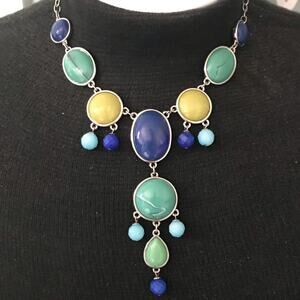 Features: Mod style statement necklace with multicolored, solid and marbled beads. Adjustable to either sit very high on the neck or just below the collarbone. Pair with a V-neck or strapless neckline to make a statement. Adds a pop of color to a simple black dress. Casual cool chic. Lobster clasp closure.
