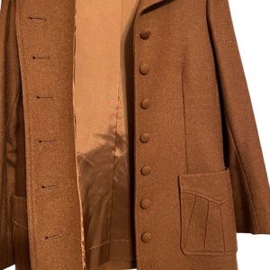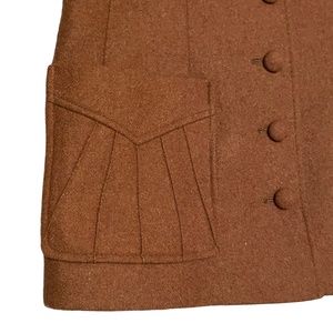 Suit is comprised of a button down lapel jacket and a high waist midi skirt with slight A-line silhouette in a warm brown color