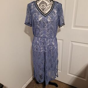 Possibility is endless with this dress. Beautiful color too. I say it's a periwinkle blue. Materials Tag missing. Lightweight and flowy. Tag says size L. Split sides.