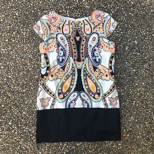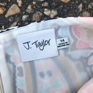 Super cute and ultra flattering J Taylor paisley dress in a slim-look polyester fabric. Fully lined. Great pattern. Condition is perfect. Size 15. Bust measures 43 inches. Hips 44 inches. Length is 36 inches from top of shoulder.