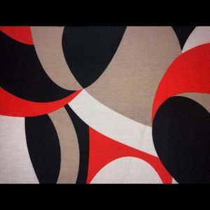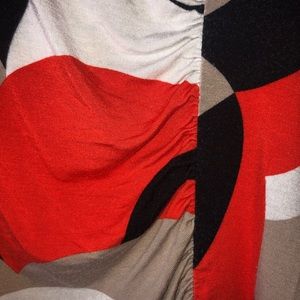 Mid-bicep length sleeve with an orange, black, white, and tan pattern. Ruching in the front left side of the abdomen. 95% rayon, 5% spandex.