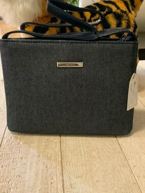 Structured denim shoulder bag with a rectangular silhouette. Small silver logo plaque on the front. Adjustable navy strap. Simple, versatile design for daily use.