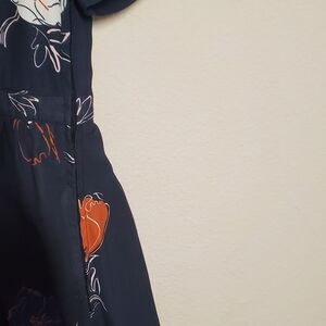 Elegant navy dress with vibrant floral patterns. Perfect for any occasion.