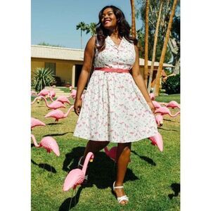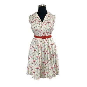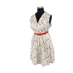 This gorgeous button down fit and flare shirt dress features beautiful pink flamingos on a white background, notch collar, side zipper and side pockets. Comes with matching pink belt.