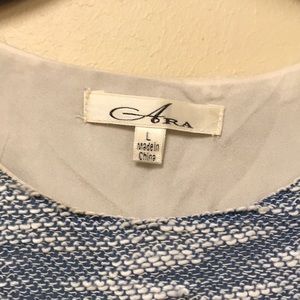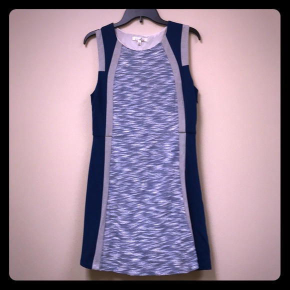 ARA for ModCloth sleeveless dress. Color block pattern with blue, light gray and white. Colors contrast very well. Flattering and slimming style. Fully lined. Side zip. Poly/nylon. Size L