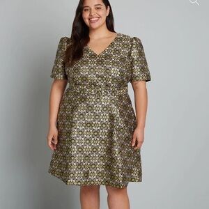 NWOT ModCloth jacquard print Made from a structured woven fabric and boasting an ornate brocade-inspired design in black, pink, ivory, and metallic gold, this fabulous fit-and-flare dress features a V-neckline, short puff sleeves, a matching and removable belt at the high waist, and a darling A-line flare skirt complete with handy side pockets. Size 10