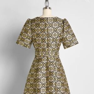 NWOT ModCloth jacquard print Made from a structured woven fabric and boasting an ornate brocade-inspired design in black, pink, ivory, and metallic gold, this fabulous fit-and-flare dress features a V-neckline, short puff sleeves, a matching and removable belt at the high waist, and a darling A-line flare skirt complete with handy side pockets. Size 10