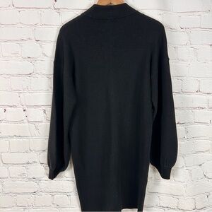 Sleek black sweater dress with a soft acrylic blend. Ideal for layering.