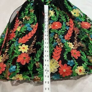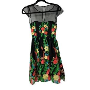 ModCloth Black Bright Garden Floral Sheer Mesh Shoulders Dress. Size XXS with measurements in the pictures. Gently used condition with no rips or stains.