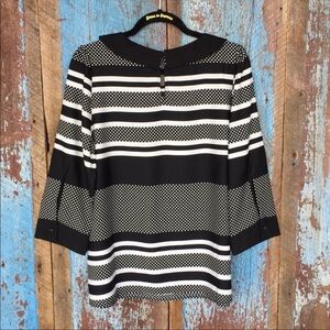 Here is a fun ModCloth Black Striped Polka Dot Peter Pan Collar Top size large that is new with button tag attached. It has a couple flaws in fabric as shown in pictures on collar and back. measurements are approximately 26 inch length, 19 inch sleeves and 21 inch width from pit to pit when flat.