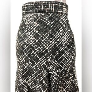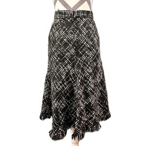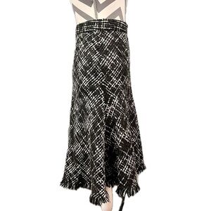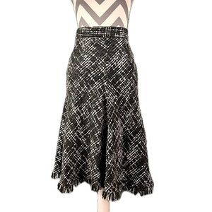 Beautiful black, white, and gray skirt. Fitted at waist and flares out to a frayed hem. This skirt is made of a tweed-like fabric. Pair it with some knee-high boots and you’ll have a day to night look!