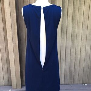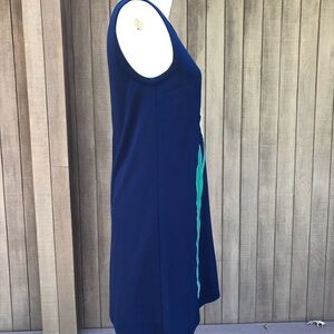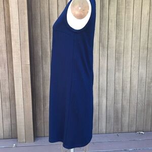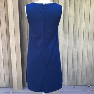 ModCloth retro 60s classic loose-fitting navy blue shift dress with large yellow daisy appliqué on the front. Boat neckline and sleeveless top. Lined. Fits at or below the knee. Polyester blend. Condition is excellent preowned without flaw.