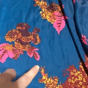 Pretty and unique pink, brown, and red floral pattern. 100% polyester. There are some some pull lines I did picture but the top is still stunning and not too noticeable