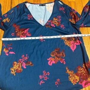 Blue Floral 3/4 Sleeve Top. Satin-like material with floral print. Buttons down the arm with small openings.
