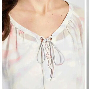 • Features: Sheer, lightweight, tie-dye pattern, lace-up neckline, smocked sleeve cuffs