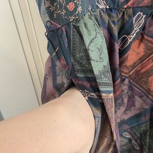 Charming dress with books pattern. Features shades of blue, pink, and green.