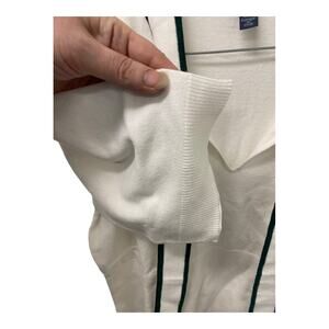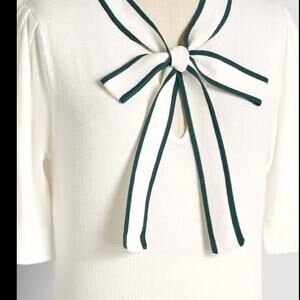 MSRP 79 Perfectly aligned with your retro-chic style, we bring you this smart and sweet ivory knit top from our ModCloth namesake label. Made from a super soft, stretchy sweater knit, this short sleeve sweater boasts a vintage-inspired tie-neckline with a keyhole at the front, highlighted by emerald green trim along the edges. The fine ribbing at the body creates a slim fit and a figure-flattering silhouette that makes this top perfect for layering under high-rise bottoms.