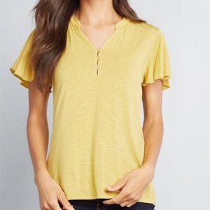 This top is a cute alternative to your basic tee. It is a really pretty goldenrod yellow with flutter sleeves, v-neck and buttoned detail. Cheerful Candor Ruffled Top - You’re the first to be frank about how fun it is to wear this deep yellow top! A flirtatious knit blouse from our ModCloth namesake label, this soft, marled top features ruffled flutter sleeves and faint gathering near the henley neckline. So cute!
