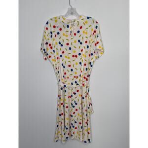 Fun and playful ModCloth fit & flare dress in size XL. Features a cheerful cherry print in red, yellow, and blue with green leaves on a white background. Short sleeves, gathered neckline, and waist tie for a flattering fit. Retro-inspired and perfect for casual outings, picnics, or summer parties. Excellent choice for fans of quirky, vintage-style fashion.