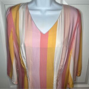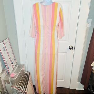ModCloth Collectif Collab Stripe Sorbet Soiree Maxi Dress Pink Multicolor Resortwear Size 6. Sweetness of summer in this creamy sorbet esque hues of this striped maxi dress Lightweight tabric with a vintage inspired vertical stripe design in pink, white, and yellow, beautiful floor length dress boasts V-neckline, elbow-length sleeves with asymmetrical detailing at cuff, and retro-fab waistline sweetly cinched by a detached pink-hued adjustable belt. Elegant for a fanciful day party, or playful enough for brunch with the girls.