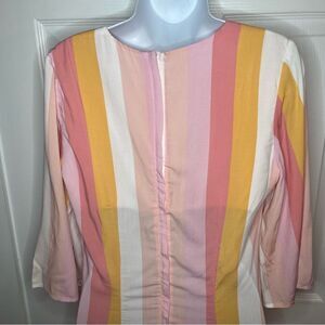 ModCloth Collectif Collab Stripe Sorbet Soiree Maxi Dress Pink Multicolor Resortwear Size 6. Sweetness of summer in this creamy sorbet esque hues of this striped maxi dress Lightweight tabric with a vintage inspired vertical stripe design in pink, white, and yellow, beautiful floor length dress boasts V-neckline, elbow-length sleeves with asymmetrical detailing at cuff, and retro-fab waistline sweetly cinched by a detached pink-hued adjustable belt. Elegant for a fanciful day party, or playful enough for brunch with the girls.