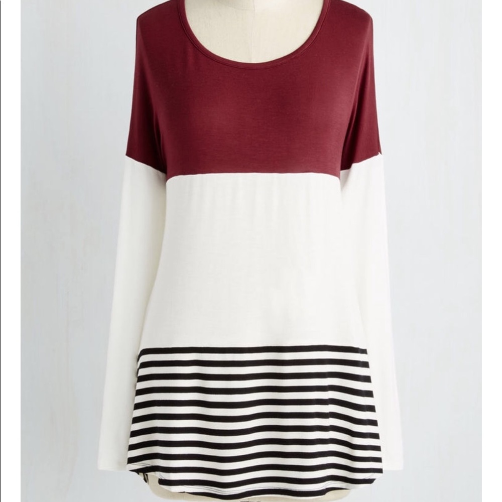 Adorable, comfortable light jersey, long-sleeve tee in burgundy, white, and black and white stripes. This top also has a line of crochet appliqué down the back. 27.5 inches long. The perfect comfy weekend top that can also be dressed up for work.