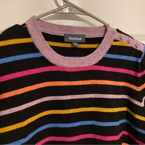Black short sleeve sweater with yellow, blue, pink, orange, and purple stripes. Purple trim at collar, sleeves and hem. Decorative button detail on left shoulder.
