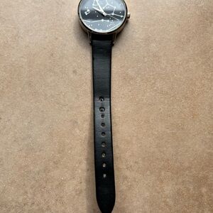 Super fun and unique constellation watch from ModCloth! Total length incl face and hardware is about 9.5 inches. There are a few extra holes added to the band (by a professional leather worker) to accommodate smaller wrist sizes. There are two very small, barely noticeable scratches in the face toward the outer edges. Note that it does need a new battery, as well.