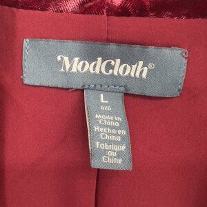 ModCloth two-piece matching set in a rich burgundy crushed velvet. Includes open-front blazer with notched lapel and coordinating high-waist elastic pants with flared leg. Size L.