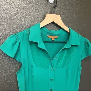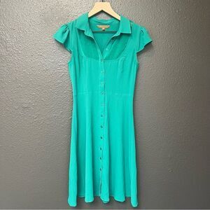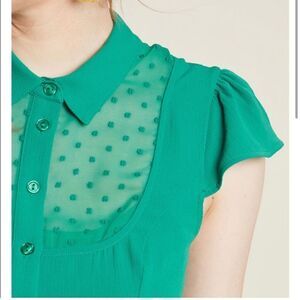 You make every step, twirl, and slide absolutely dashing by sporting this jade green dress while executing your choreography! Featuring gently puffed cap sleeves, a sharp collar, and sassy Swiss-dotted mesh accent at the neckline, this buttoned beauty from our ModCloth namesake label makes your style the envy of everyone on the floor.