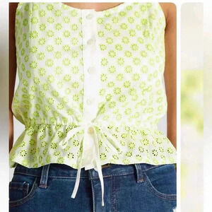 Elevate your wardrobe with this ModCloth Darling for the Prairie Peplum Tank Top in white and acid green floral. Inspired by classic cottagecore aesthetics and vintage 1970s charm, this romantic tank features delicate embroidered eyelet floral patterns and frilly ruffle-trimmed straps for a feminine touch. The full button-up front closure and adjustable drawstring waist create a flattering peplum hem, adding subtle structure to this breezy design.
