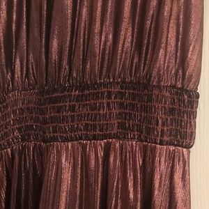 Dress from ModCloth. Only worn once. Metallic pink with ruching at waist and collar. Only worn once. Fabric provides stretch. Dress comes lined. I am 5'6 and it hits just below the knee. Dress tag is medium, but size is adjustable because of the stretch at waist and neck. See close up photo for a detailed look at how the metallic fabric looks.