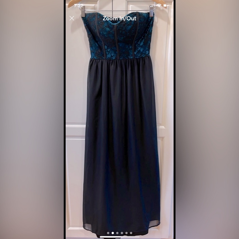 Double lined with sheer overlay. Worn a couple times with no flaws. Mid back zipper.