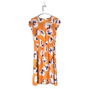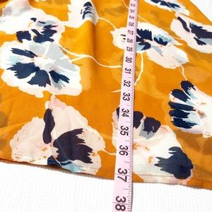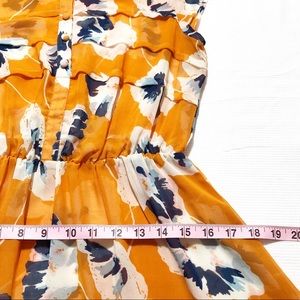 In great used condition ModCloth floral dress in size Small. Background color is mustard yellow with navy blue, light blue, white and pink colors. Has a stretchy waistline. Sheer and see through. Does not come with a slip dress underneath.